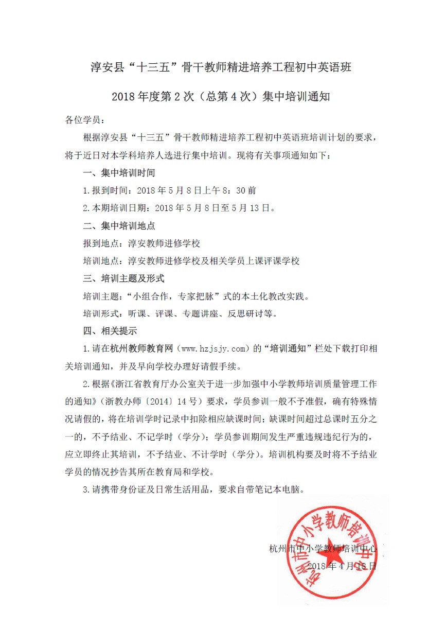附件:淳安县“十三五”骨干教师精进培养工程初中英语总第4次集中培训通知.pdf